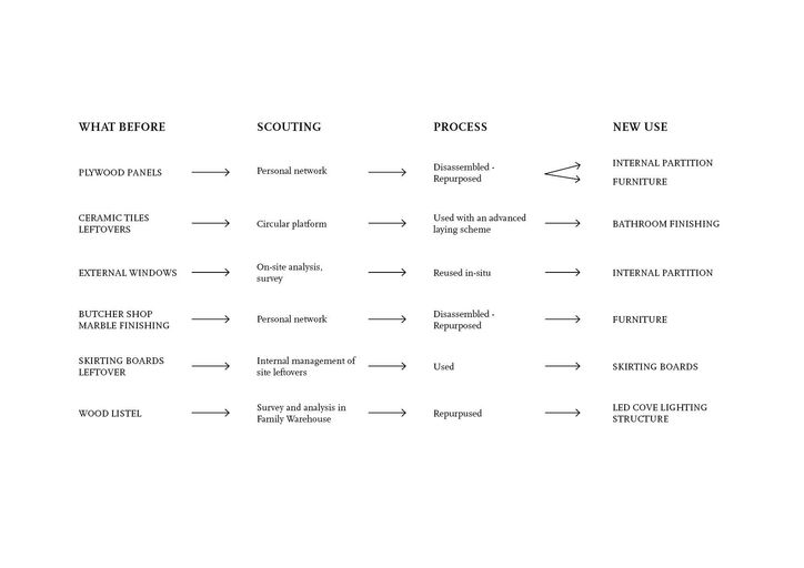 Multistrato di pino, Serramenti in legno esistenti, Zoccolini e legno di recupero, Sfridi di piastrelle ceramiche Marmo di Carrara (cucina)