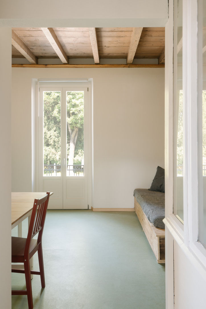 La sfida era mantenere tre locali distinti senza compromettere la qualità spaziale. Nonostante l’approccio adattivo la nostra prima mossa è stata ribaltare la logica distributiva, integrando la cucina nel soggiorno per aprirli al parco monumentale di Villa Recalcati. Il corridoio è così diventato un cannocchiale puntato sul parco. Nello stesso spirito, la demolizione dei controsoffitti ammalorati ha svelato il solaio ligneo originale, memoria materica che abbiamo conservato per unificare l'intero appartamento. Il pavimento in linoleum verde (materiale costituito al 97% da materie prime naturali) completa il dialogo cromatico con l'esterno.