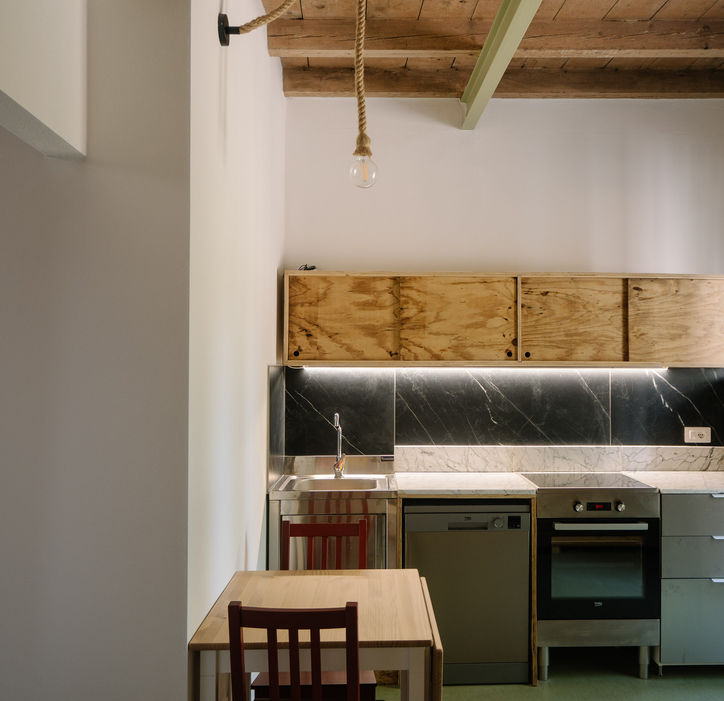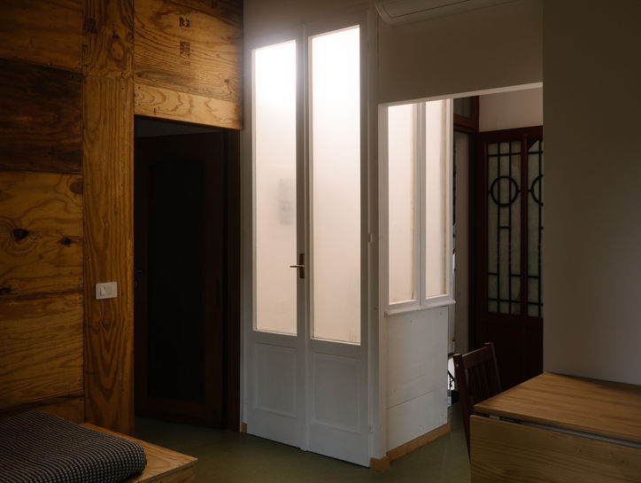 Da qui, ogni scelta è nata dall'ascolto dei materiali, da una serie di scoperte e da episodi di risignificazione. Il soggiorno-cucina, spazio fluido tra ingresso ed esterno, è definito da una parete in legno recuperato da imballaggi industriali e attraversato da una trave in acciaio riemersa durante i lavori. Il bagno, in soli 4 metri quadri, è un esercizio di upcycling. Piastrelle destinati al macero (scarti di magazzino di un rivenditore edile) sono state composte in un mosaico per definire e ordinare lo spazio: il bianco per la doccia, il nero per il lavabo, il grigio come sfondo ai sanitari. A unificare questo racconto cromatico è il pavimento, che guida lo sguardo verso la finestra. È una strategia compositiva che non solo caratterizza l'ambiente, ma ne amplia la percezione, trasformando il limite in un plusvalore. La scoperta di un antico arco murario, lasciato a vista come nicchia, ha aggiunto un frammento di memoria. La trasformazione più radicale è quella del ripostiglio, che solitamente da angolo buio della casa qui si fa lanterna di luce. Abbiamo recuperato i serramenti originali, rendendone opachi i vetri per trasformarlo da semplice contenitore a dispositivo luminoso. Ora diffonde una luce diffusa e diventa il perno visivo della casa: la sua traslucenza genera visioni diagonali inaspettate, che rompono la costrizione del corridoio e mettono in dialogo tutti gli ambienti.